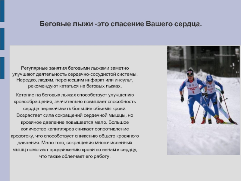 деятельность сердечно-сосудистой системы. Нередко, людям, перенесшим инфаркт или инсульт, рекомендуют кататься на беговых лыжах.