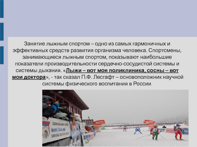 развития организма человека. Спортсмены, занимающиеся лыжным спортом, показывают наибольшие показатели производительности сердечно-сосудистой системы и системы дыхания. «Лыжи – вот моя поликлиника, сосны – вот мои доктора», - так сказал П.Ф. Лесгафт – основоположник научной системы физического воспитания в России.