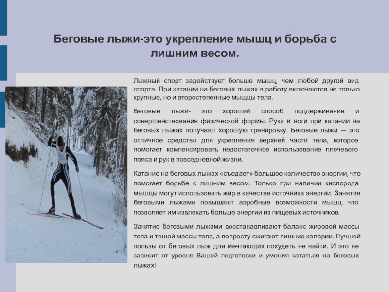 Слайд 8Беговые лыжи-это укрепление мышц и борьба с лишним весом.