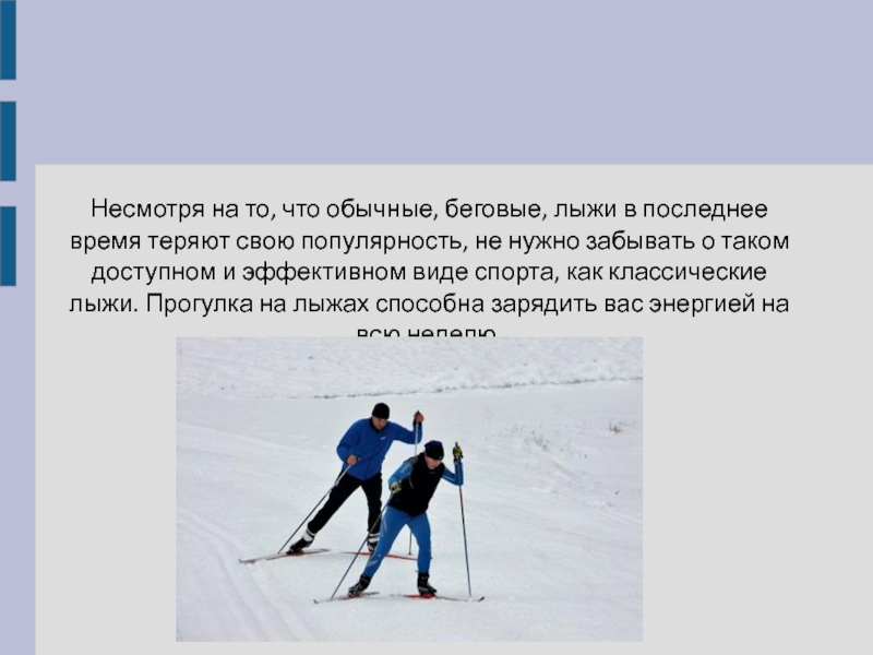 свою популярность, не нужно забывать о таком доступном и эффективном виде спорта, как классические лыжи. Прогулка на лыжах способна зарядить вас энергией на всю неделю.