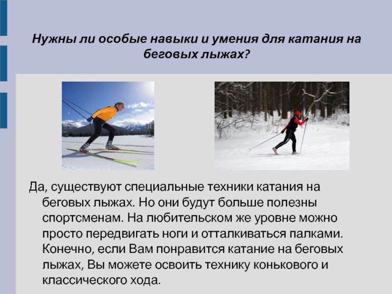 Слайд 10Нужны ли особые навыки и умения для катания на беговых лыжах?