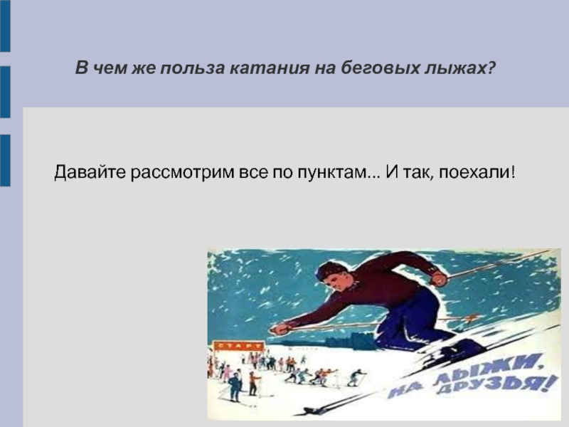 Слайд 3Беговые лыжи- это мощная подзарядка хорошей энергией от природы
