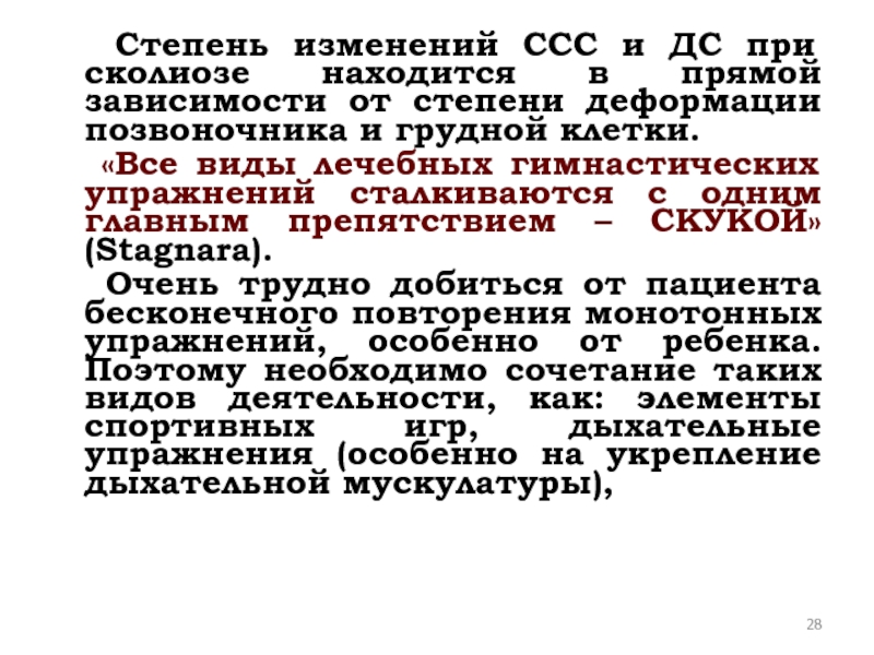 Слайд 28 Степень изменений ССС и ДС при сколиозе находится в