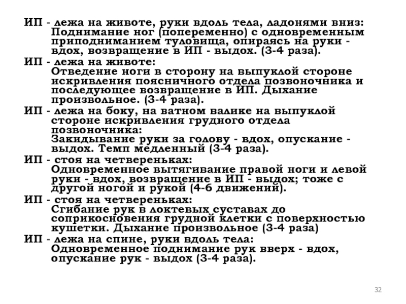 Слайд 32ИП - лежа на животе, руки вдоль тела, ладонями вниз: