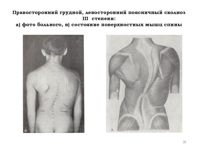 Слайд 20Правосторонний грудной, левосторонний поясничный сколиоз III степени: