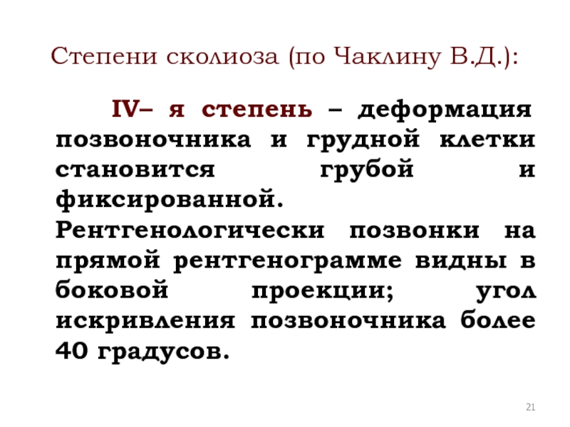Слайд 21Степени сколиоза (по Чаклину В.Д.):