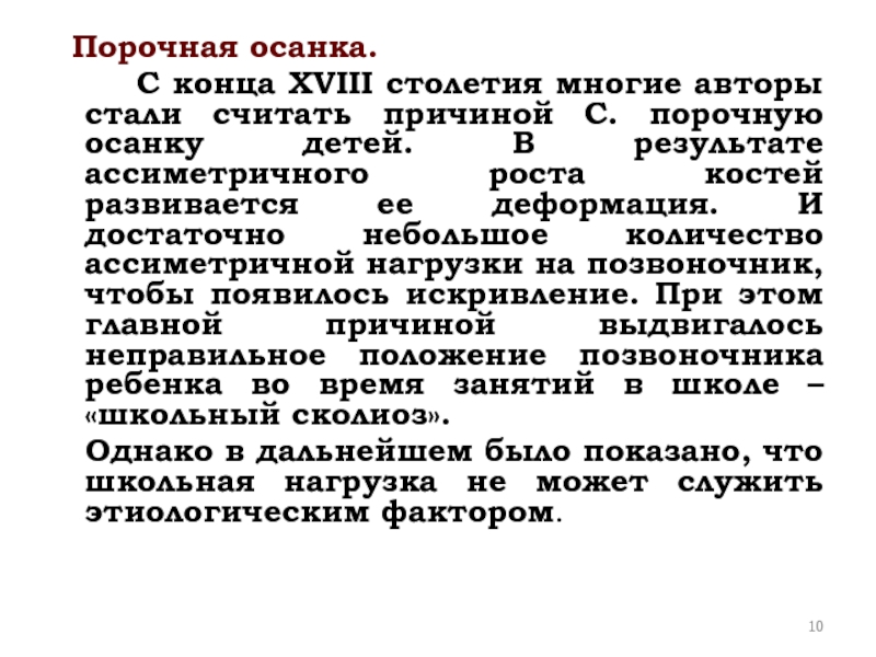 столетия многие авторы стали считать причиной С. порочную осанку детей. В результате ассиметричного роста костей развивается ее деформация. И достаточно небольшое количество ассиметричной нагрузки на позвоночник, чтобы появилось искривление. При этом главной причиной выдвигалось неправильное положение позвоночника ребенка во время занятий в школе – «школьный сколиоз».