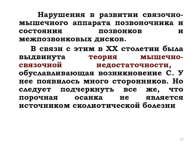 В связи с этим в ХХ столетии была выдвинута теория мышечно-связочной недостаточности, обуславливающая возникновение С. У нее появилось много сторонников. Но следует подчеркнуть все же, что порочная осанка не является источником сколиотической болезни