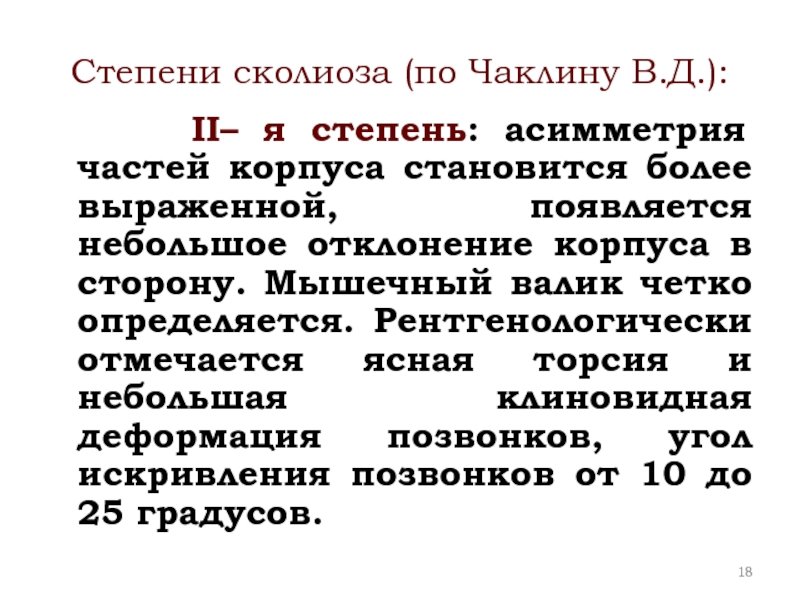 Слайд 18Степени сколиоза (по Чаклину В.Д.):