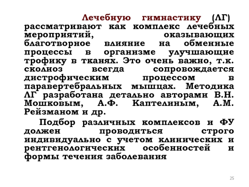 Слайд 25 Лечебную гимнастику (ЛГ) рассматривают как комплекс лечебных