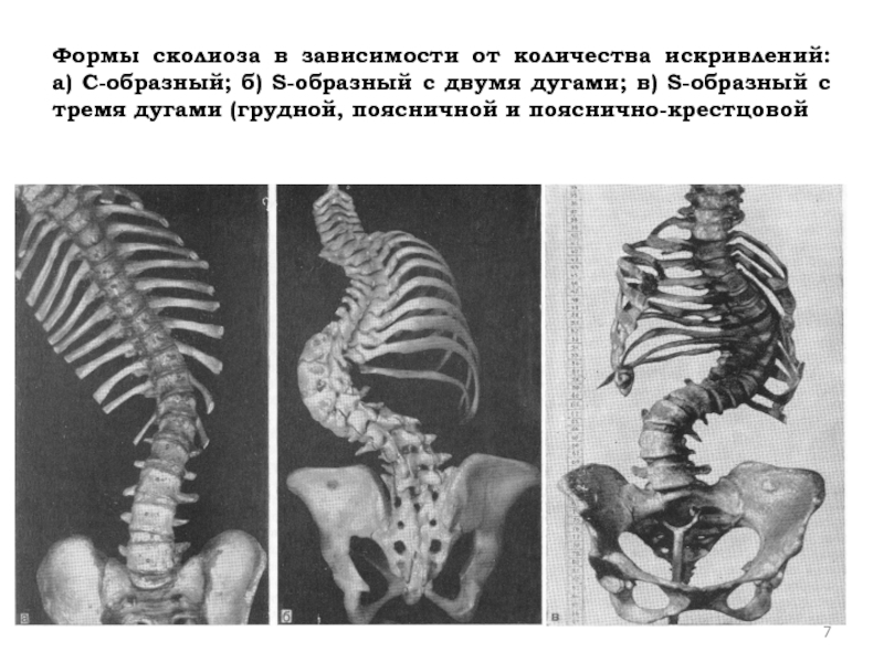 Слайд 7Формы сколиоза в зависимости от количества искривлений: