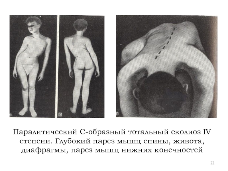 Слайд 22Паралитический С-образный тотальный сколиоз IV степени. Глубокий парез мышц спины, живота,