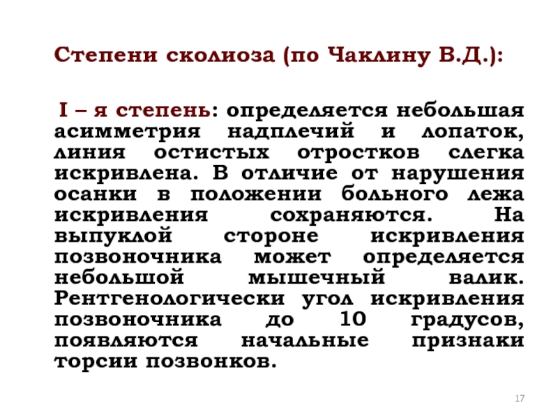 Слайд 17Степени сколиоза (по Чаклину В.Д.):