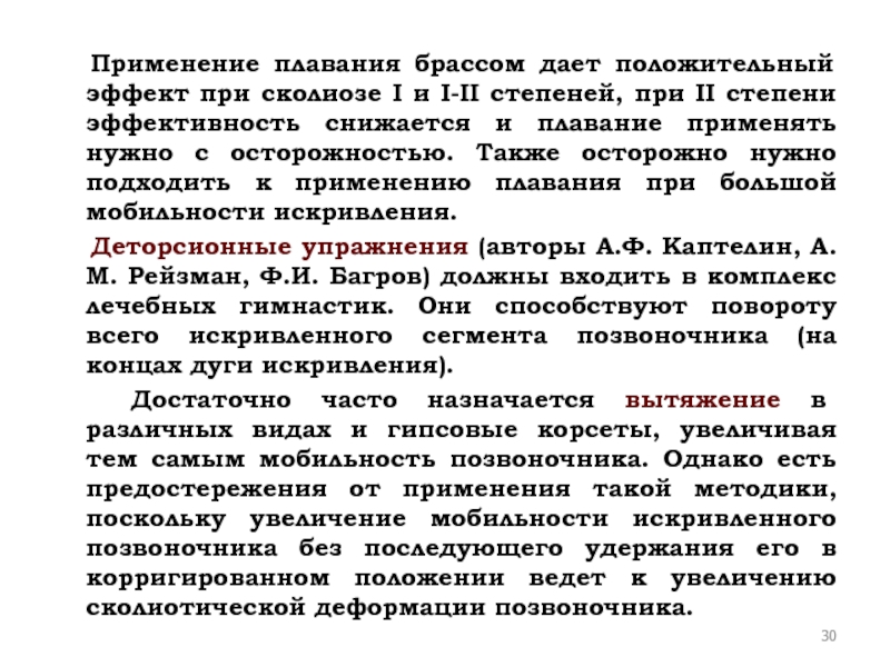 Слайд 30 Применение плавания брассом дает положительный эффект при сколиозе I