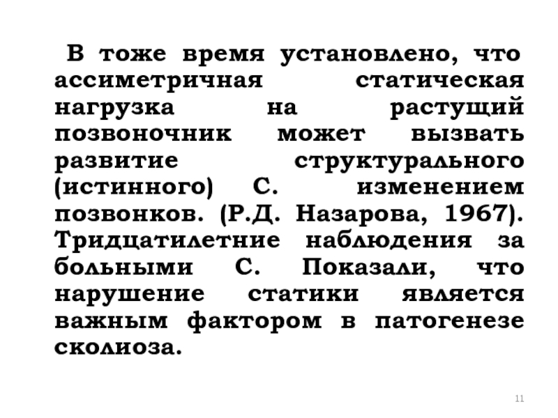 растущий позвоночник может вызвать развитие структурального (истинного) С. изменением позвонков. (Р.Д. Назарова, 1967). Тридцатилетние наблюдения за больными С. Показали, что нарушение статики является важным фактором в патогенезе сколиоза.