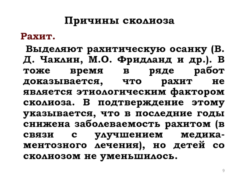 М.О. Фридланд и др.). В тоже время в ряде работ доказывается, что рахит не является этиологическим фактором сколиоза. В подтверждение этому указывается, что в последние годы снижена заболеваемость рахитом (в связи с улучшением медика-ментозного лечения), но детей со сколиозом не уменьшилось.
