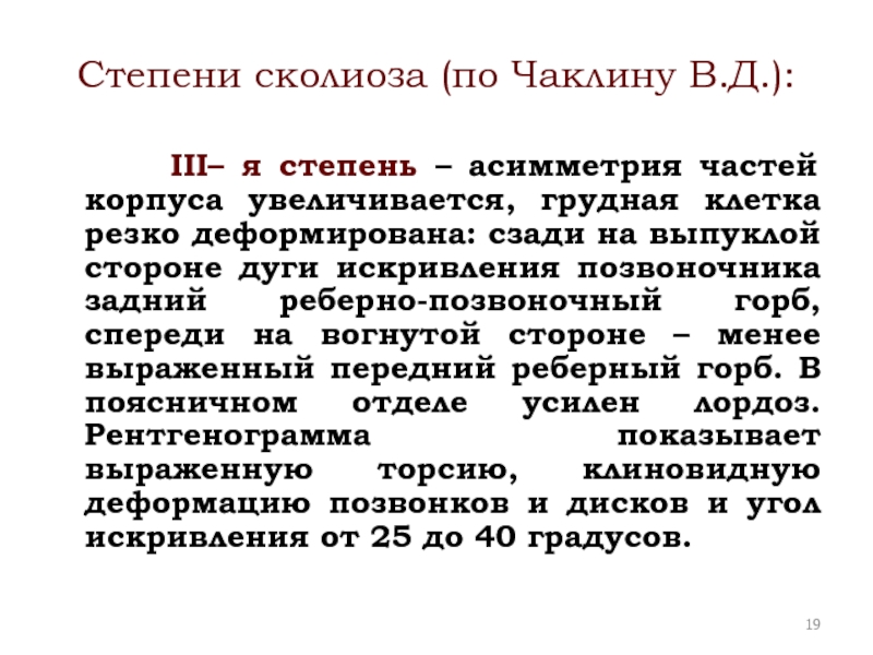Слайд 19Степени сколиоза (по Чаклину В.Д.):