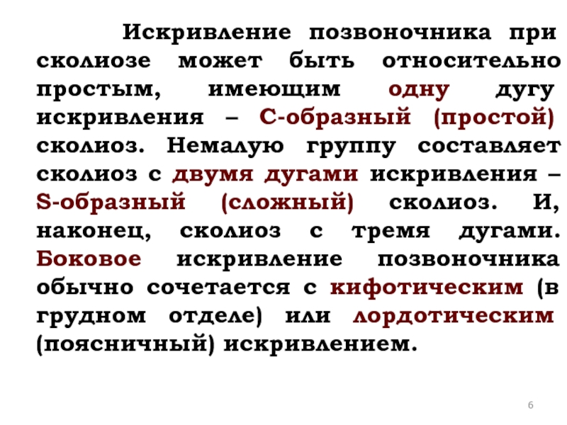 простым, имеющим одну дугу искривления – С-образный (простой) сколиоз. Немалую группу составляет сколиоз с двумя дугами искривления – S-образный (сложный) сколиоз. И, наконец, сколиоз с тремя дугами. Боковое искривление позвоночника обычно сочетается с кифотическим (в грудном отделе) или лордотическим (поясничный) искривлением.