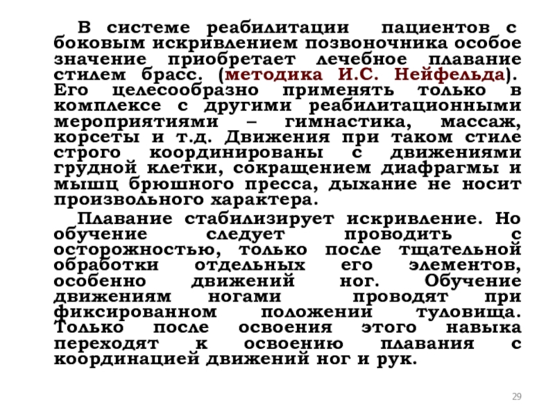 Слайд 29 В системе реабилитации пациентов с боковым искривлением позвоночника особое