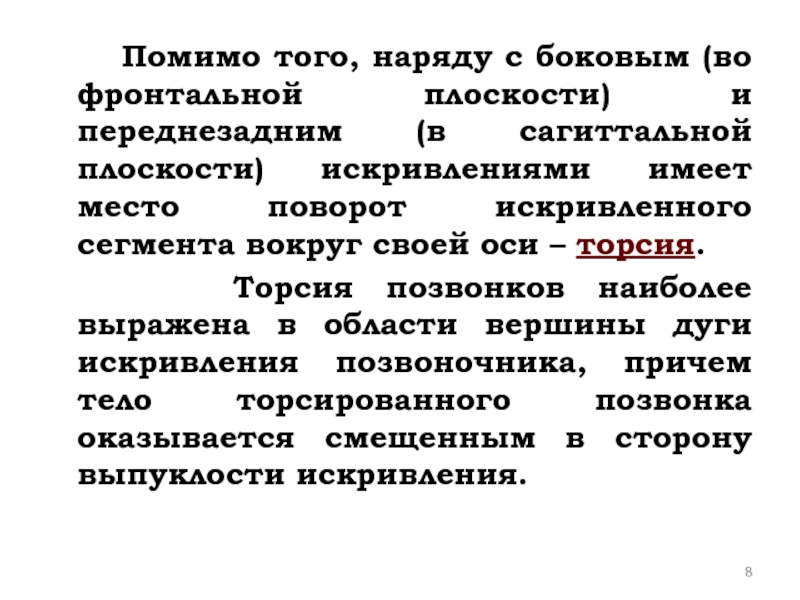 и переднезадним (в сагиттальной плоскости) искривлениями имеет место поворот искривленного сегмента вокруг своей оси – торсия.