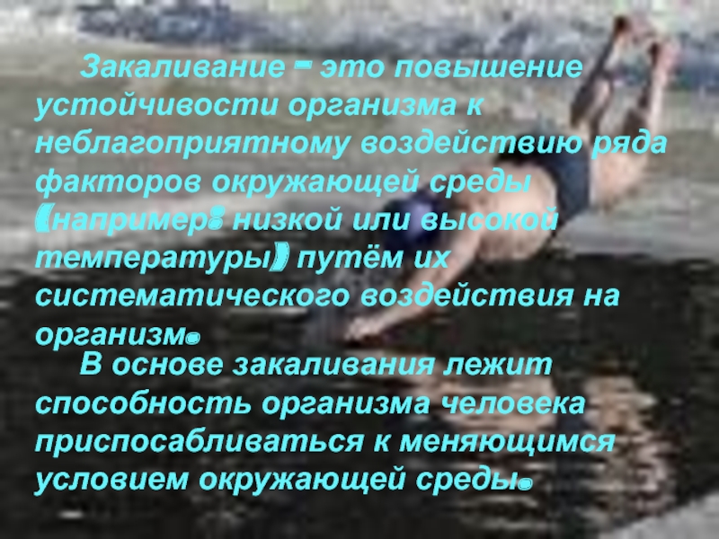 Слайд 2 Закаливание – это повышение устойчивости организма к неблагоприятному воздействию