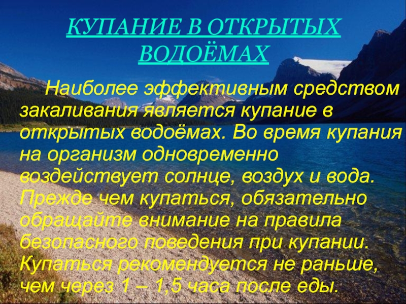 водоёмах. Во время купания на организм одновременно воздействует солнце, воздух и вода. Прежде чем купаться, обязательно обращайте внимание на правила безопасного поведения при купании. Купаться рекомендуется не раньше, чем через 1 – 1,5 часа после еды.
