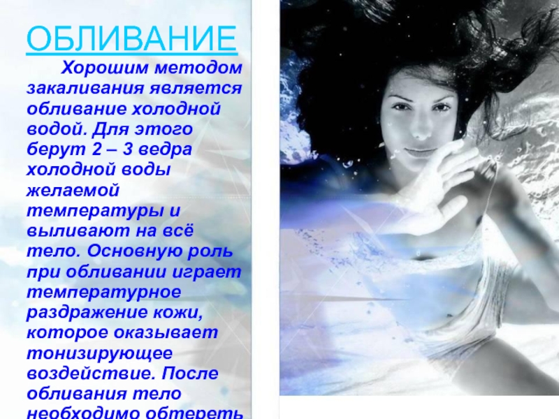 берут 2 – 3 ведра холодной воды желаемой температуры и выливают на всё тело. Основную роль при обливании играет температурное раздражение кожи, которое оказывает тонизирующее воздействие. После обливания тело необходимо обтереть сухим полотенцем.