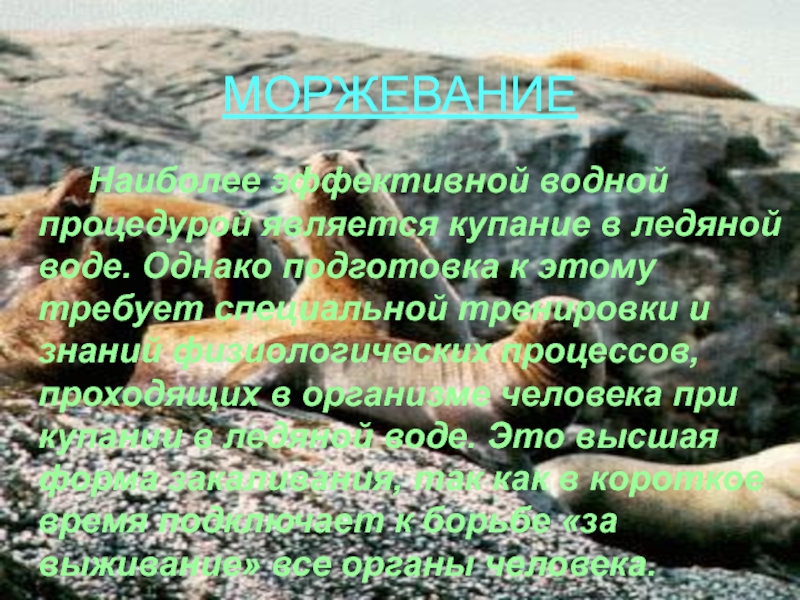 подготовка к этому требует специальной тренировки и знаний физиологических процессов, проходящих в организме человека при купании в ледяной воде. Это высшая форма закаливания, так как в короткое время подключает к борьбе «за выживание» все органы человека.