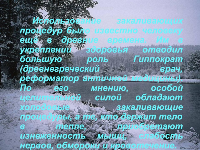 Слайд 3 Использование закаливающих процедур было известно человеку ещё в древние времена.