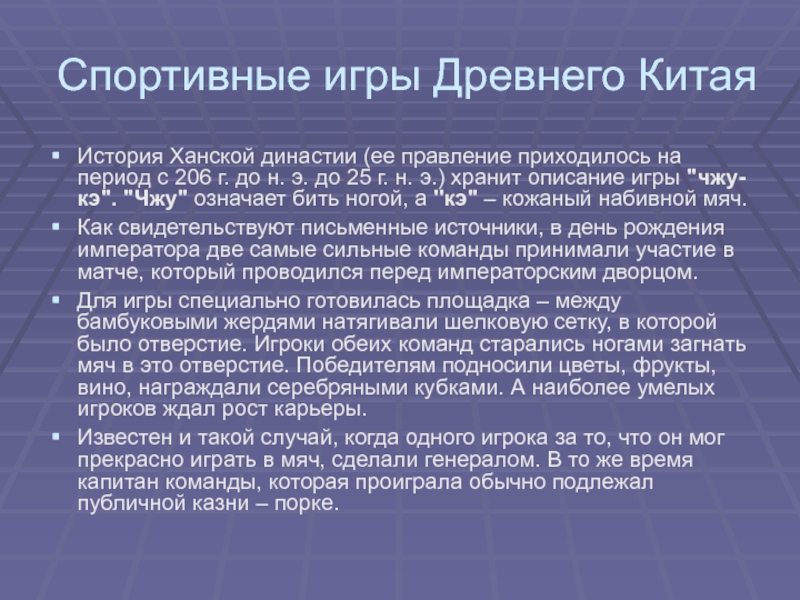 с 206 г. до н. э. до 25 г. н. э.) хранит описание игры "чжу-кэ". "Чжу" означает бить ногой, а "кэ" – кожаный набивной мяч.