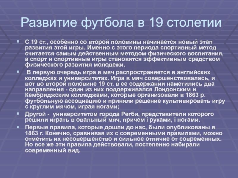 В первую очередь игра в мяч распространяется в английских колледжах и университетах. Игра в мяч совершенствовалась, и вот во второй половине 19 ст. в ее содержании наметились два направления - один из них поддерживался Лондонским и Кембриджским колледжами, которые организовали в 1863 р. футбольную ассоциацию и приняли решение культивировать игру с круглим мячом, играя ногами;