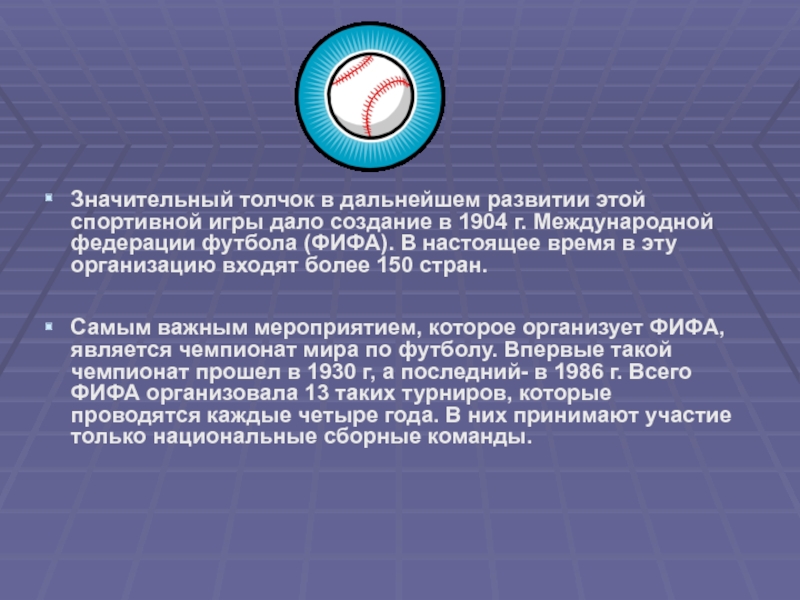 1904 г. Международной федерации футбола (ФИФА). В настоящее время в эту организацию входят более 150 стран.
