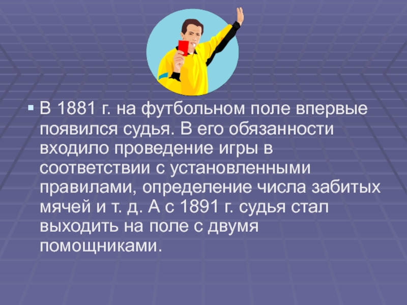 обязанности входило проведение игры в соответствии с установленными правилами, определение числа забитых мячей и т. д. А с 1891 г. судья стал выходить на поле с двумя помощниками.