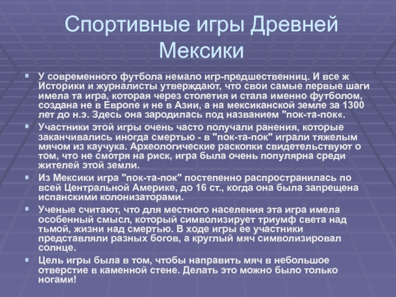 Историки и журналисты утверждают, что свои самые первые шаги имела та игра, которая через столетия и стала именно футболом, создана не в Европе и не в Азии, а на мексиканской земле за 1300 лет до н.э. Здесь она зародилась под названием "пок-та-пок«.