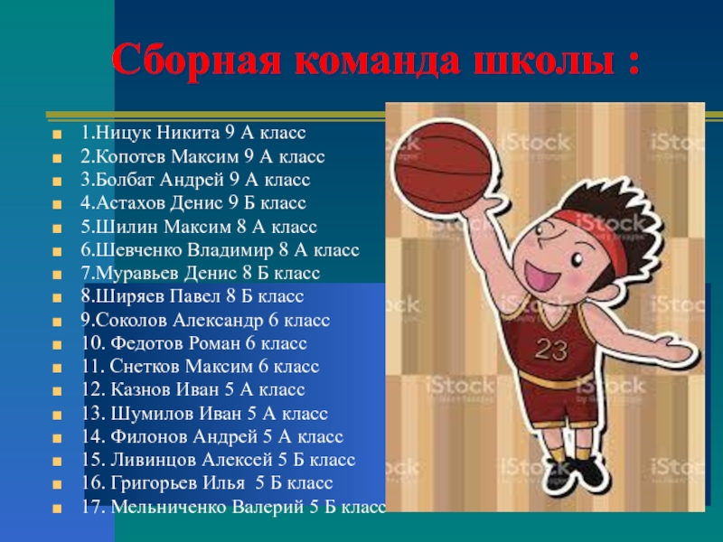 Сборная команда школы :1.Ницук Никита 9 А класс2.Копотев Максим 9 А класс3.Болбат Андрей 9 А класс4.Астахов Денис
