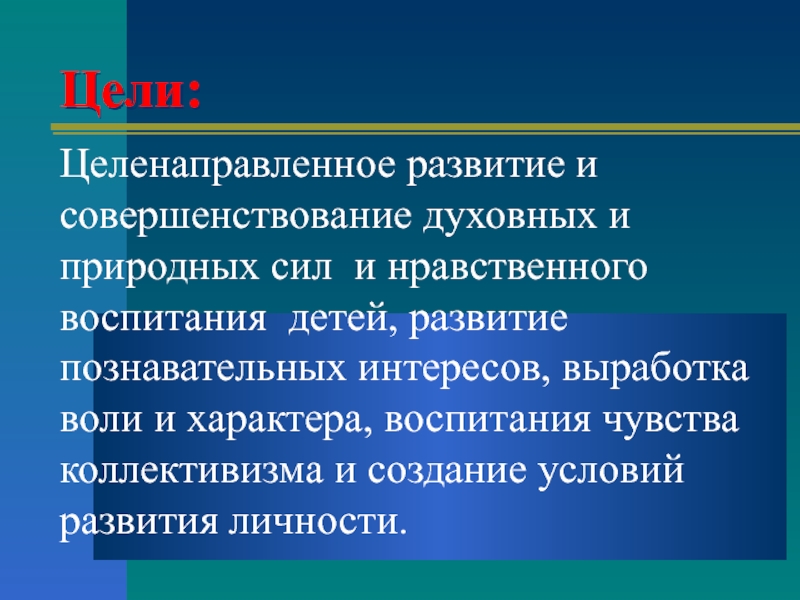 Цели:Целенаправленное развитие и совершенствование духовных и природных сил и нравственного воспитания детей, развитие познавательных интересов, выработка воли и характера, воспитания чувства коллективизма и создание условий развития личности.
