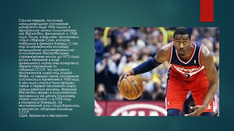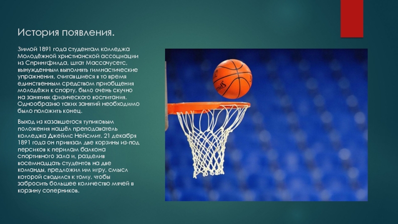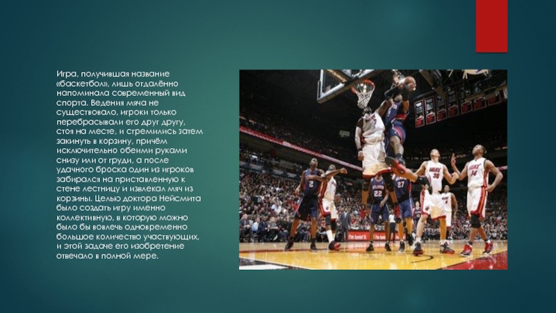 Слайд 3Игра, получившая название «баскетбол», лишь отдалённо напоминала современный вид спорта. Ведения