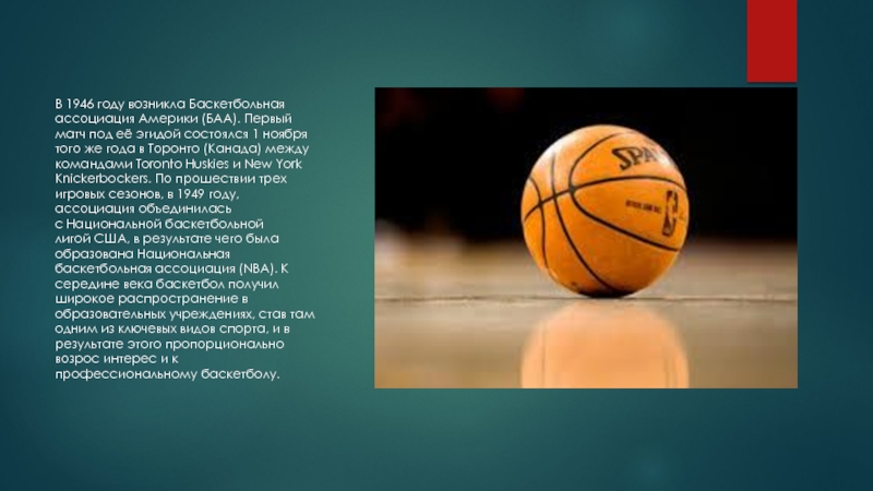 Слайд 7В 1946 году возникла Баскетбольная ассоциация Америки (БAA). Первый матч под её эгидой состоялся 1
