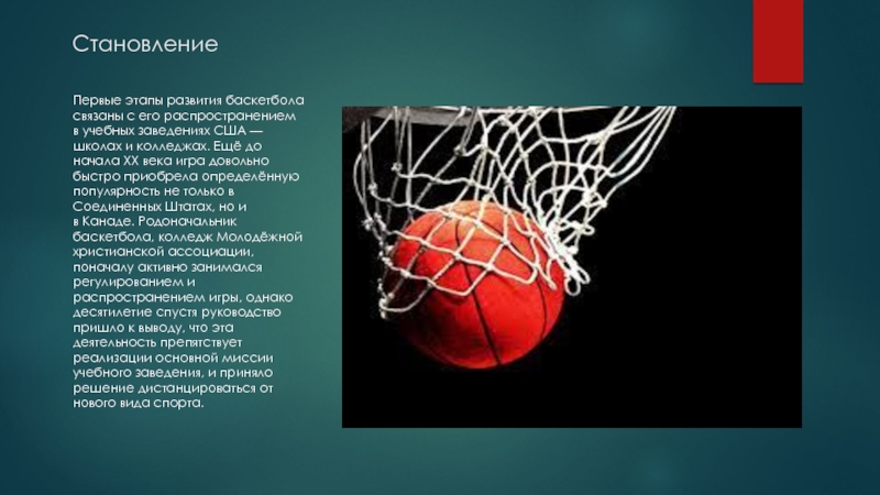Первые этапы развития баскетбола связаны с его распространением в учебных заведениях