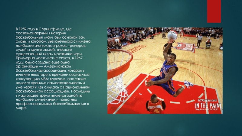 основан Зал славы, в котором увековечиваются имена наиболее значимых игроков, тренеров, судей и других людей, внесших существенный вклад в развитие игры. Примерно десятилетие спустя, в 1967 году, была создана еще одна организация — Американская баскетбольная ассоциация, которая в течение некоторого времени составляла конкуренцию NBA; впрочем, она также недолго хранила самостоятельность и уже через 9 лет слилась с Национальной баскетбольной ассоциацией. Последняя в настоящее время является одной из наиболее влиятельных и известных профессиональных баскетбольных лиг в мире.