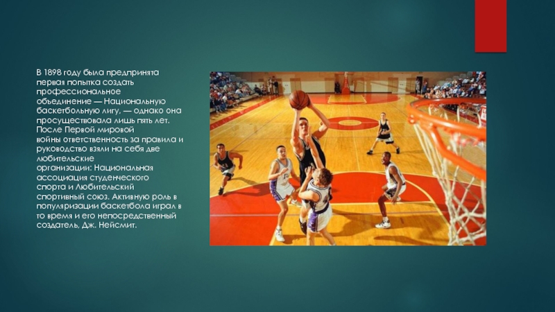 Слайд 5В 1898 году была предпринята первая попытка создать профессиональное объединение — Национальную баскетбольную лигу, —