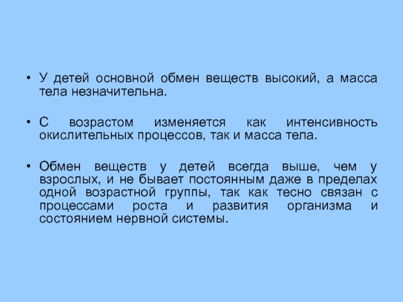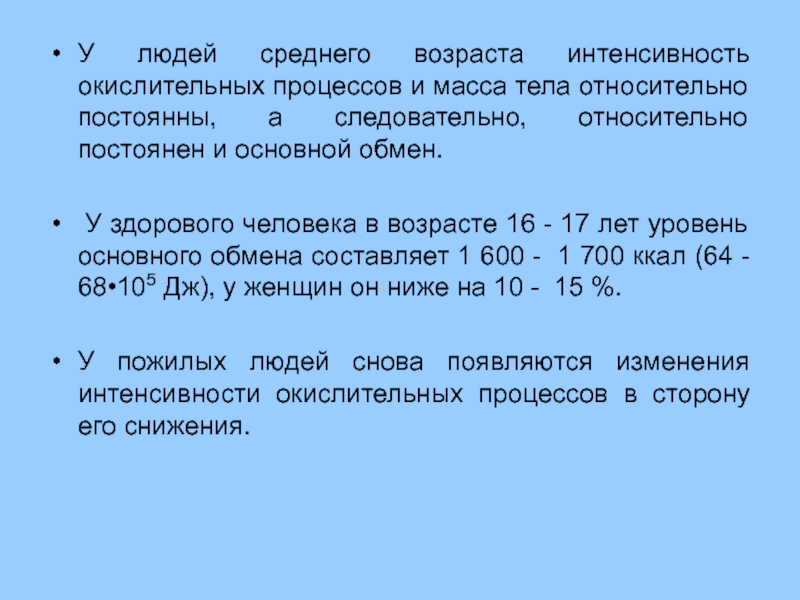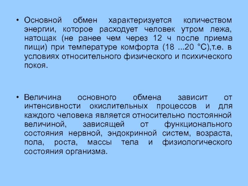 Величина основного обмена зависит от интенсивности окислительных процессов и для каждого человека является относительно постоянной величиной, зависящей от функционального состояния нервной, эндокринной систем, возраста, пола, роста, массы тела и физиологического состояния организма.