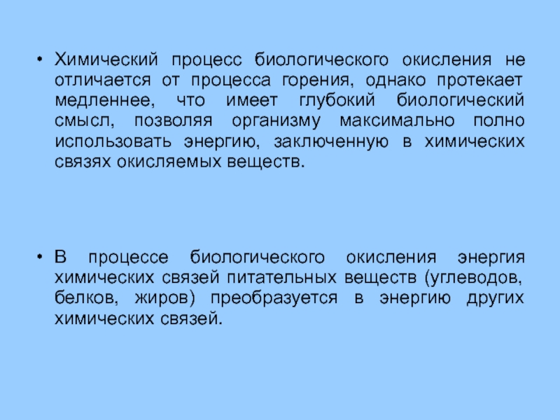 медленнее, что имеет глубокий биологический смысл, позволяя организму максимально полно использовать энергию, заключенную в химических связях окисляемых веществ.