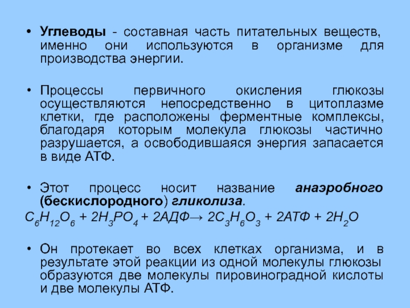 C6H12O6 + 2H3PO4 + 2АДФ→ 2C3H6O3 + 2АТФ + 2Н2О