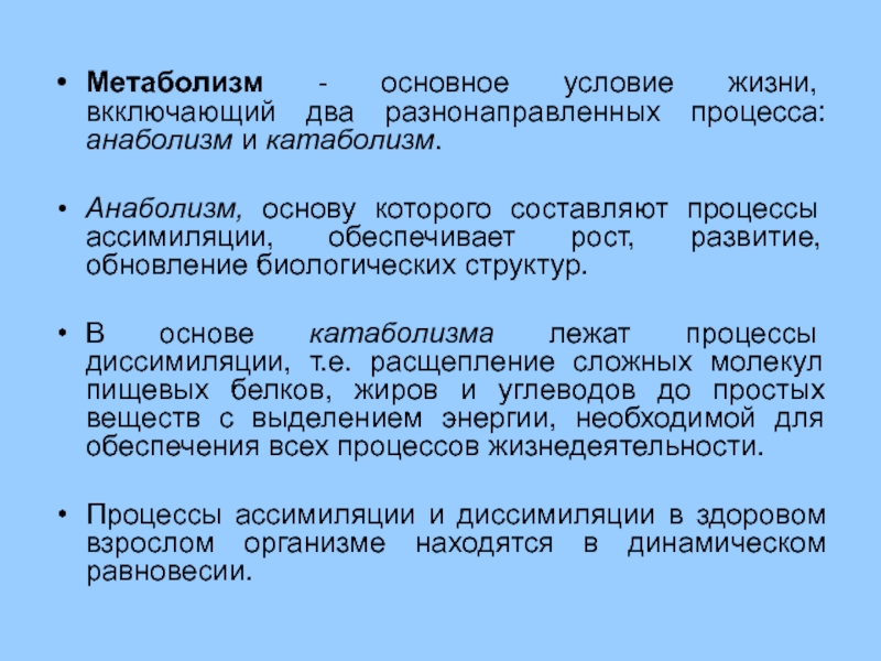 Процессы ассимиляции и диссимиляции в здоровом взрослом организме находятся в динамическом равновесии.