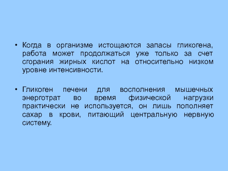 Если организм на некоторое время лишен пищи, то его жизнедеятельность поддерживается за счет окисления накопленных заранее резервов углеводов (в печени и мышцах), жиров (жировая ткань), а также белков (мышечная ткань).