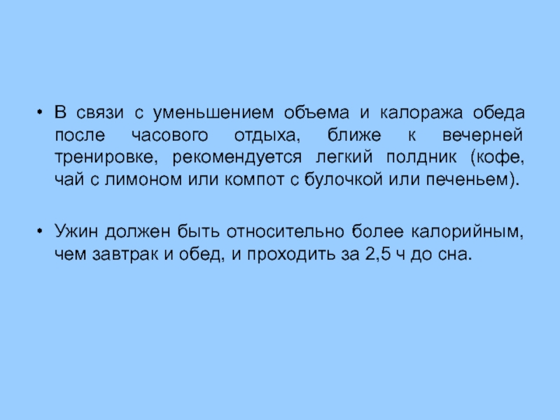 ближе к вечерней тренировке, рекомендуется легкий полдник (кофе, чай с лимоном или компот с булочкой или печеньем).