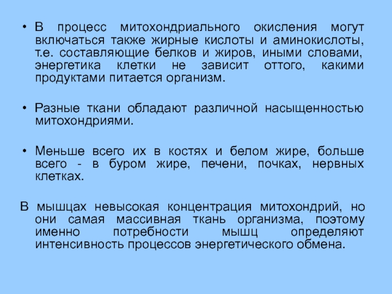 В процесс митохондриального окисления могут включаться также жирные кислоты и аминокислоты,