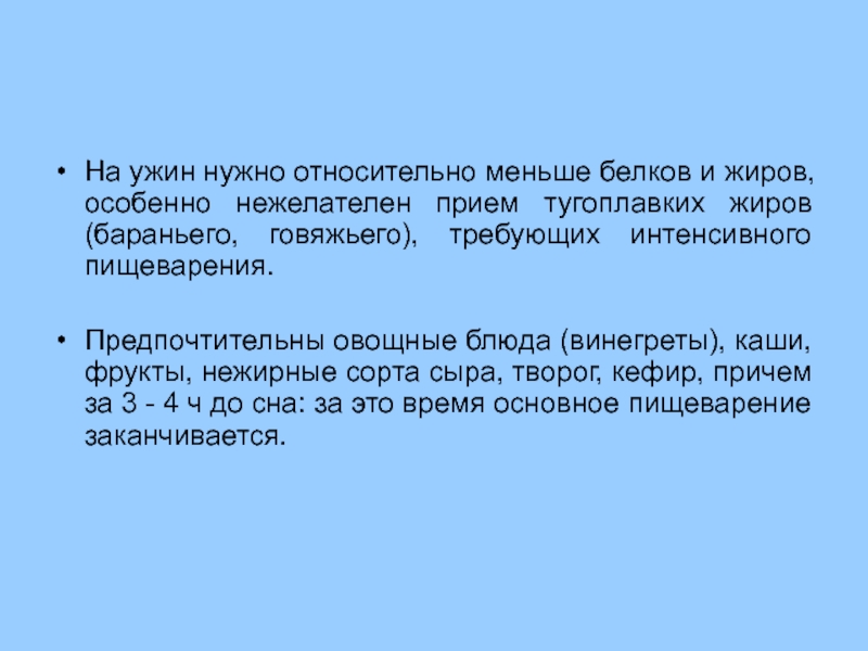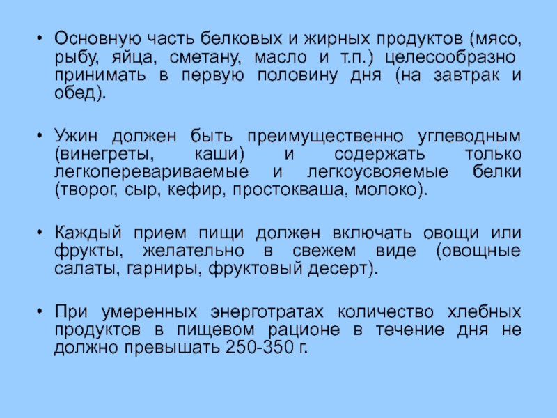 Ужин должен быть относительно более калорийным, чем завтрак и обед, и проходить за 2,5 ч до сна.