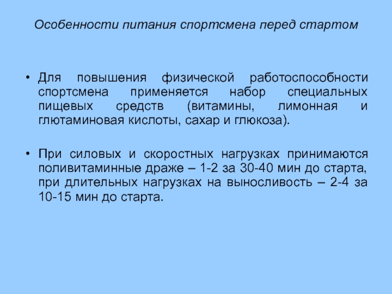 Слайд 80Особенности питания спортсмена перед стартом